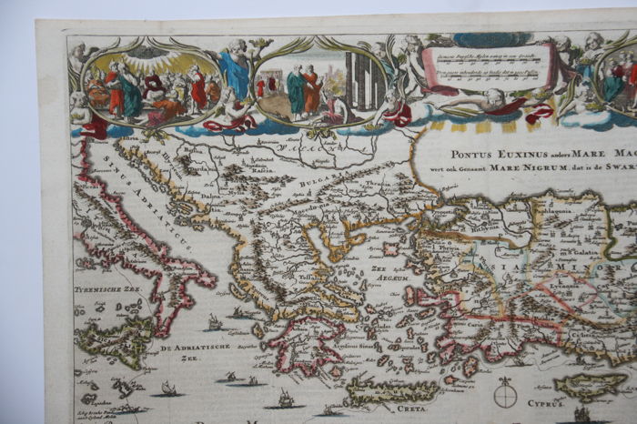 The synod of Dordrecht of 1618 ordered a proper Dutch translation of the bible, which resulted in the Statenbijbel of 1637. One of the most popular printed versions was the Keur-bijbel. The Keur family published a Dutch version from 1666 until 1756. In 1682 they added 6 maps in their work, one of which being Apostle Paul’s Journeys. The idea of illustrating the bible with a series of maps was soon followed by a number of other book printers. Jan van den Avele published his bible from 1687 onwards. He modeled his maps on the views by Keur. This map was made for the book Acts of the Apostles (drafted by Luke): “Dese Kaart wert gestelt voor de Handeling der Apostelen”.