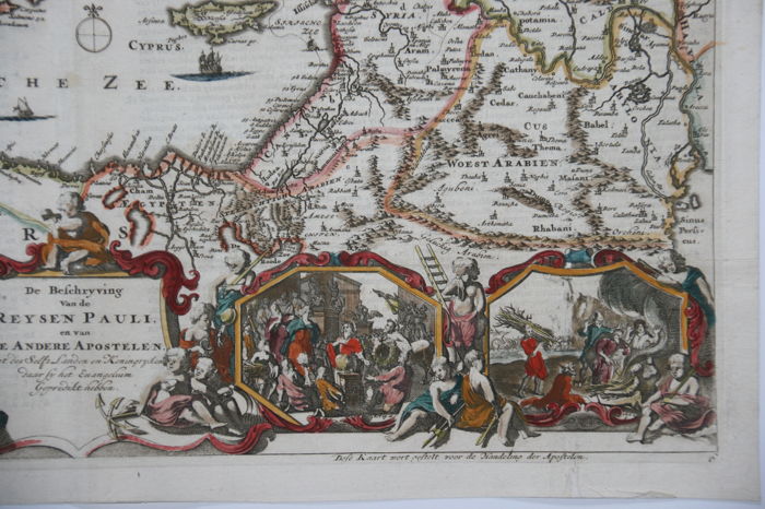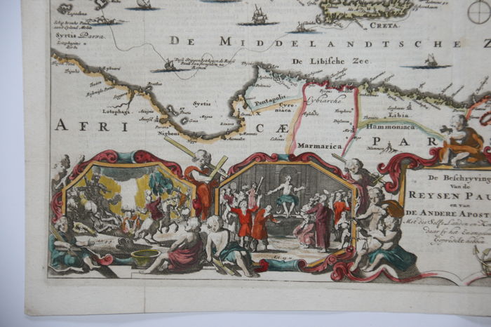 A sharp eye distinguishes the dotted line on the Mediterranean Sea indicating his trip as a prisoner to Rome. At the far left is written: “Schip breuke Pauli aan‘t Eyland Melite”; the shipwreck is put in detail in the right bottom cartouche. This carte-à-figures depicts eight cartouches with scenes from this book of the New Testament. The left bottom one shows the conversion of Paul (with reference “Act. 9.4”).