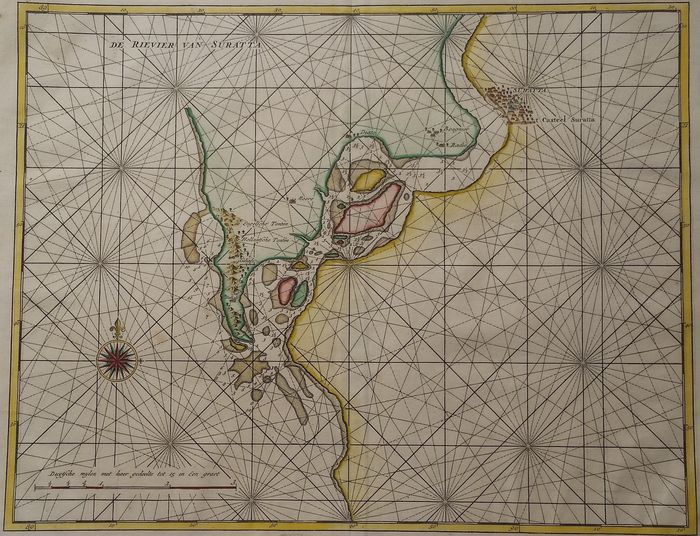 In 1615 (?) sir Thomas Roe (Ambassador for King James I) succeeded to secure from the fourth Mogul Emperor Jahangir (based in Agra) trading rights for the East India Company in Suratte (at the same named river; see also Valentyn, 1726). Suratte would become a directorate of the Dutch East India Company in 1616. The map data are attributed to Thomas Roe (see panting) and William Baffin (the British Explorer of the Arctic and discoverer in 1616 of Baffin Island).