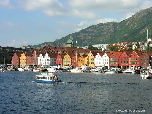 This map portrays the mighty fjord systems of Southern Norway. A wonder of nature. The first fjord starting from the right is Oslofjord with the city (in red) at the top of the fjord. All described fjords are at a 3 hour drive from Oslo! At the Mare Germanicum (vulgo De Noord Zee) the Stavangerfjord (also in green). Between these fjord systems lies the largest plateau in Europe (enjoying a micro-climate), the Hardangervidda (on this map identifiable as Tellemarck): only 600 meters high, however, enjoying such micro-climate, but still sufficiently to get us stuck in snow (for a few hours) a few years ago… in the middle of August (this is no fake news!). Further North one recognizes the one and only big city (in red): Bergen, founded in 1070 and assuming the function of capital of Norway since the 13th century. (A few km South of Bergen you can visit the house of the composer Edvard Grieg).